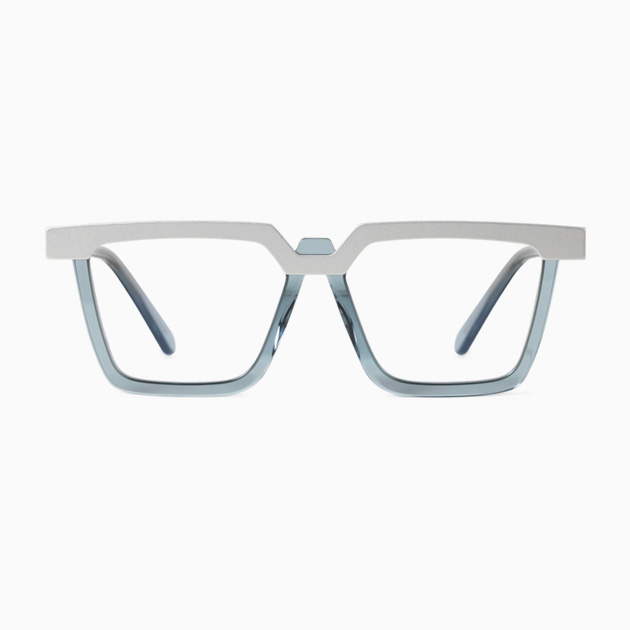 These glasses, characterised by their bold and geometric design, embody a raw, unapologetic aesthetic. Like parts of a perfect machine, the acetate frame intersects with the aluminium bar, creating a sophisticated bond. Minimal, clean lines, emphasising simplicity and elegance, contrast with brutalist, substantial volumes. The interplay of these elements results in a frame that is not only sharp and decisive, but also exudes a sense of audacity and courage.